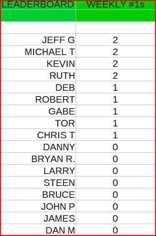 Since Ruth won again. she is added to the “2 weekly win” gang: