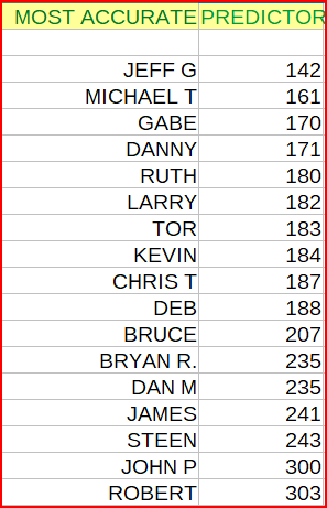 Plus in the most accurate predicter, no change. Jeff is still killin it: